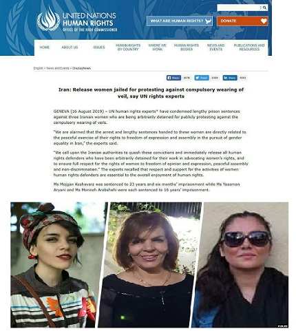 ژنو – كارشناسان حقوق بشر سازمان ملل احكام زندان طولانی مدت علیه سه زن ایرانی كه بخاطر اعتراض علنی به حجاب اجباری بصورت خودسرانه ای بازداشت شدند را محكوم كرده اند.