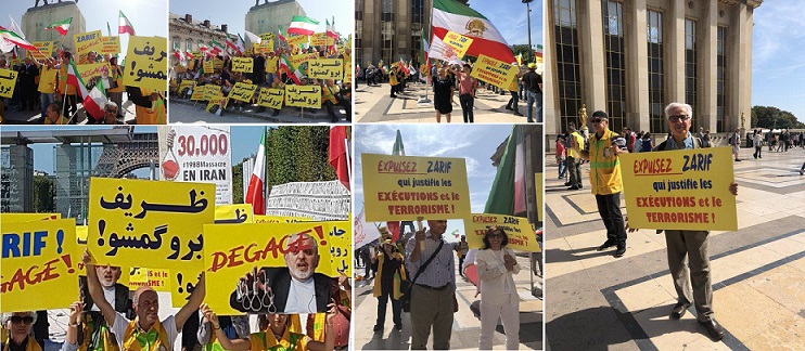 تظاهرکنندگان از شورای ملی مقاومت ایران روز جمعه ۲۳ اوت ۲۰۱۹ در میدان تروکادرو پاریس در حالیکه جواد ظریف وزیر خارجه ایران در فرانسه حضور دارد، تظاهرات میکنند. بنر نوشته است: برو گمشو.