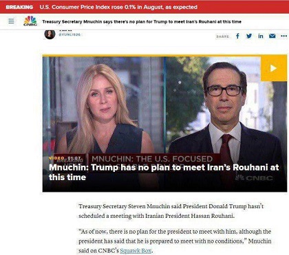 استیون منوچین وزیر خزانهداری آمریکا روزپنجشنبه۲۱ شهریور ۱۳۹۸اعلام کرد که هیچ برنامهای برای دیدار دونالد ترامپ و حسن روحانی وجود ندارد. منوچین تاکید کرد که کارزار فشار حداکثری علیه رژیم ایران همچنان ادامه خواهد داشت.