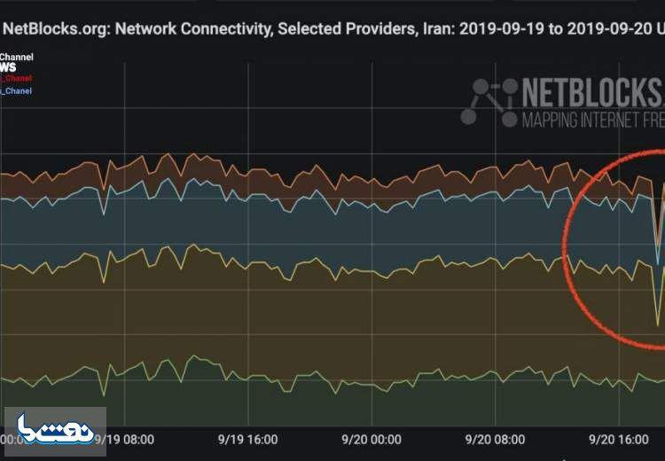 تصویر نمودار اختلال در اینترنت ایران، که حملات سایبری به تاسیسات نفتی را تایید میکند.