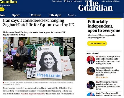 ظریف گفت، پرداخت بدهی لندن به تهران به معنای باج نبود و به عنوان وزیر خارجه هیچ نقشی در تصمیمات قضایی برای یک شهروند ایرانی ندارد: «اما من میتوانم برای فرد خارجی متهم به جاسوسی، مداخله کنم و به دادگاه پیشنهاد بد هم.
