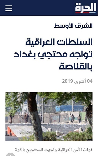 الحره به نقل از الشرق الاوسط: نیروهای امنیتی عراق روز جمعه ۱۲ مهرماه ۹۸ به معترضین در مرکز بغداد شلیک کردند. صدها نفر برای چهارمین روز در تظاهرات علیه دولت تجمع کردند و حداقل یک نفر در روز جمعه به شدت مجروح شد.