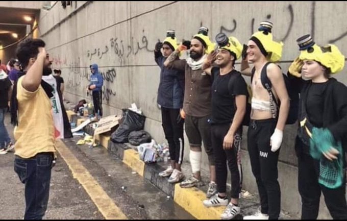 گروهی از جوانان عراقی که گازهای اشک آور را خاموش میکنند.