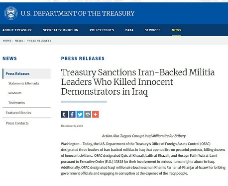 وزارت خزانهداری آمریکا روز جمعه ۶ دسامبر اعلام کرد ۳ عراقی وابسته به گروههای شبهنظامی مورد حمایت رژيم ایران را به دلیل نقش آنها در کشتار معترضان و نقض حقوق بشر در این کشور مشمول تحریم قرار داده است. یک تاجر عراقی به نام خمیس الخنجر نیز به دلیل فساد تحریم شده است.