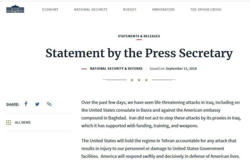 ایالات متحده رژیم تهران را در قبال هرگونه حمله ای که منجر به آسیب دیدگی به پرسنل ما یا آسیب رساندن به امکانات دولت ایالات متحده باشد ، پاسخگو خواهد کرد. آمریکا در دفاع از زندگی آمریکاییان، سریع و قاطعانه پاسخ خواهد داد.