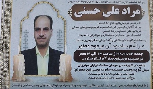 مرادعلی حسینی، که در آبان ماه در قلعه حسن خان در غرب تهران دستگیر شده بود یکی دو روز پیش پلیس زنگ زده و به خانواده اش گفته بیایید جنازه ا ش را که در باغهای شهریار پیدا شده، تحویل بگیرید .