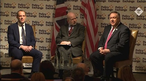 مایک پمپئو پنجشنبه ۱۰ بهمن ۹۸ در یک کنفرانس مشترک مطبوعاتی با دومینیک راب وزیر خارجه انگلستان در لندن گفت: «رژیم ایران همچنان بزرگترین حامی تروریسم است. ما مطمئن هستیم کاری که ایالات متحده انجام داده تا فشار فوقالعادهای بر اقتصاد آنها وارد کند، توانایی آنها را برای آسیب رساندن بهدیگران از جمله در همین انگلستان کاهش داده است. رژیم ایران کارزارهای ترور را در سراسر اروپا پیش برده است. همه فجایع بشردوستانه در سوریه توسط سران رژیم ایران دامن زده میشود. محروم کردن آنها از پول، راه درست رو به جلو است تا وادارشان کنیم تصمیم های سختی بگیرند.