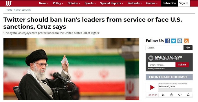 سناتور تد کروز یکی از رهبران جمهوریخواهان در نامه ای از توییتر بعنوان یک موجودیت آمریکایی درخواست کرد که روابط تجاری خود را با ایران قطع نماید و گرنه به دلیل دادن اجازه داشتن اکانت به آخوندها و سرکردگان رژیمشان با تحریم ها یی مواجه خواهد شد. او و مارکو روبیو و تام کاتن و مارشا بلکبرن گفته اند که توییتر تحریم های تجاری با ایران را نقض کرده است. این تحریم ها علاوه بر محصولات تولیدی شامل پشتیبانی تکنولوژی نیز می شوند. آقای کروز گفته است که فراهم آوردن بستر اینترنی برای خامنه ای و ظریف نقض تحریم هاست.
