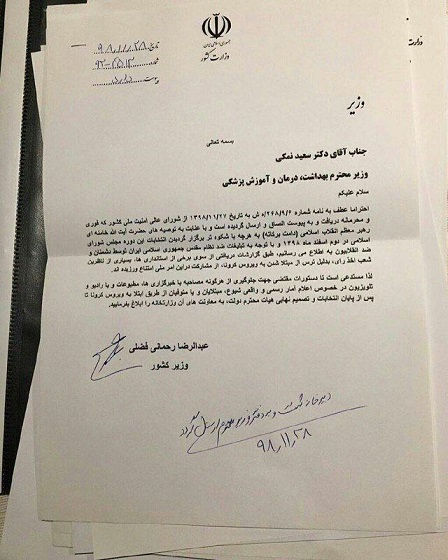 رحمانی فضلی در این نامه و دستور محرمانه به وزیر بهداشت نوشته است برخی از ترس ویروس کرونا حاضر نمیشوند پای صندوق رای بیایند لذا خواستار مخفی کاری در مورد مبتلایان به ویروس کرونا در ایران شده است. باید به هرکس که میخواهد پای صندوق نمایش انتخابات نظام برود گفت که داری میری به ویروسی کشنده تر از کرونا رای میدی!