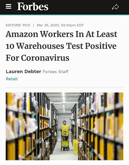 نشریه فوربس اعلام کرد که تست کرونا کارمندان آمازون در ۱۰ انبار آمریکا مثبت بوده است. این یعنی میلیونها نفر آمریکایی که از فروشگاه اینترنتی آمازون هم خرید کردهاند هم اکنون در خطر ابتلا به کرونا هستند.