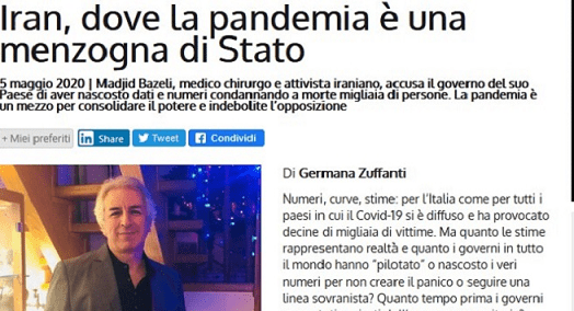اما در این میان، ایران موردی است که سزاوار توجه بیشتری است، یکی از پزشکان عضو انجمن پزشکان ایرانی در ایتالیا و هوادار شورای ملی مقاومت ایران در تلاش است تا اطلاعات واقعی درام ویروس کرونا در کشورش را که قبلا تا حدی مورد توجه قرار گرفته، روشن کند و آگاهی عمومی را در مورد اوضاع غم انگیز پیش روی هم وطنان خود افزایش دهد.