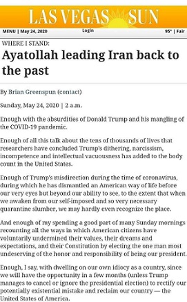 نشریه لاس وگاس سان :امروز ، می خواهیم روی حماقتهای رژیمی تمرکز کنیم که همگی موافقیم که دوست ما نیست. رژیمی که همه ما می توانیم توافق داشته باشیم که دوست جهان نیست و رژیمی که باید به هر قیمتی، روشهای جنایتکارانه و بدخواهانهاش تغییر کند.