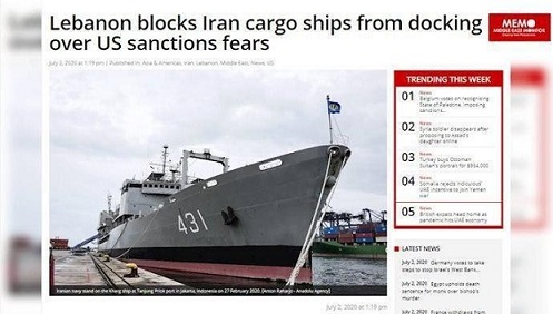 سایت میدل ایست مموری روز ۱۲تیرماه نوشت: لبنان مانع از لنگر انداختن کشتی باری رژیم ایران در ساحل این کشور شد.