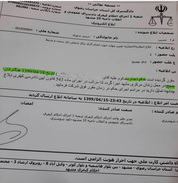 …امروز شرمنده دو فرزند خردسال و همسر موکلم شدم که علیرغم تلاش یک ساله ام و بهرمندی از تمامی امکانات و مشورت با اساتید بزرگ و همکاران عزیزم این دفاع مفید فایده قرار نگرفت و امروز فرزندان موکلم دیگر دارای پدر نیستند….». هدف از این حکم جنایتکارانه مقابله با قیام مردم است. اما نباید از این احکام ظالمانه و جنایتکارانه که «برخلاف نص صریح فرمان حضرت علی به مالک اشتر درباره ملاطفت و مدارا و مهر و محبت با توده مردم است.» نباید ترسید و «قضاییه جلادان سزاوار آتش است».