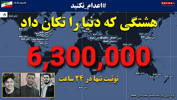 بر اثر فشارهای داخلی و بینالمللی و توفان میلیونها توئیت از جانب هموطنانمان در شبکههای اجتماعی که قضاییه جلادان را بهخاطر احکام اعدام سه جوان شورشگر قیام آبان زیر سنگینترین فشارها قرار داد، میلیونها ایرانی از هر طیفی، معلم، دکتر، طراح، آشپز، هنرپیشه، مدیر، هنرمند، خانهدار، وبلاگنویس از رسانههای اجتماعی استفاده کردند تا پیام محکومیت اعدام را به رژیم آخوندی بدهند و نوشتند: اعدام نکنید.