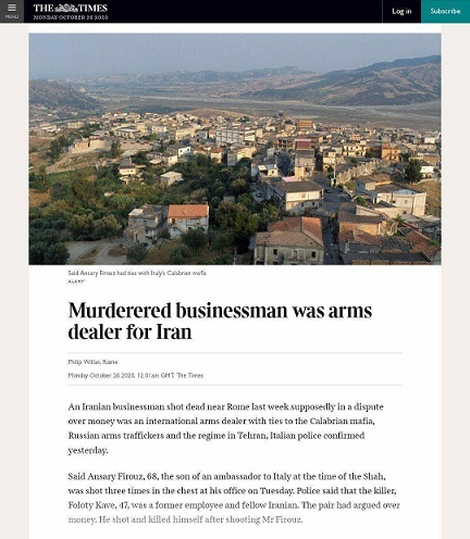 ساندی تایمز در گزارشی از قول پلیس ایتالیا خبر داد که فیروز سعید انصاری، تاجر ایرانیتبار که هفته گذشته در نزدیکی شهر رم و «طی نزاعی بر سر پول به ضرب گلوله» کشته شده است یک فروشنده بینالمللی اسلحه و نزدیک به مافیای کالابران و قاچاقچیان اسلحه روسی و همچنین رژیم جمهوری اسلامی بوده است.