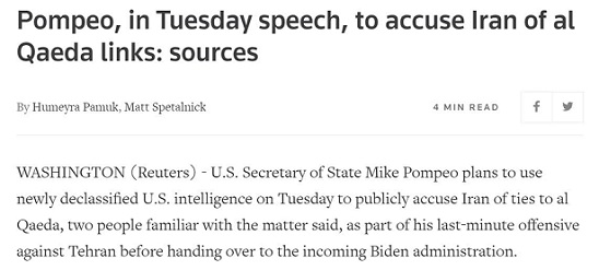 مایك پمپئو وزیر امور خارجه آمریكا قصد دارد از اطلاعات تازه طبقه بندی نشده آمریكا در روز سه شنبه برای متهم كردن علنی رژیم ایران به ارتباط با القاعده استفاده كند.منابع گفتند ، با وجود باقی ماندن تنها هشت روز از ریاست جمهوری دونالد ترامپ ، انتظار می رود پمپئو جزئیاتی را درباره ادعاهایی كه رژیم ایران به رهبران القاعده پناهگاه امن داده و از این گروه حمایت می كند ، ارائه دهد . وی می تواند اطلاعات محرمانه ای را در مورد کشته شدن فرمانده ارشد القاعده در تهران در ماه اوت ذکر کند. نیویورک تایمز در ماه نوامبر گزارش داده بود که ابومحمد المصری ، متهم به کمک به سازماندهی بمب گذاری در سال 1998 در دو سفارت ایالات متحده در آفریقا ، توسط عوامل اسرائیلی در ایران مورد اصابت گلوله قرار گرفته است. مشاوران جو بایدن بر این باورند که دولت ترامپ تلاش می کند تعامل مجدد او با ایران و تلاش برای پیوستن دوباره به یک توافق بین المللی درباره برنامه هسته ای ایران را برای او دشوارتر کند.