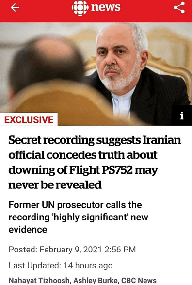 سازمان اطلاعات کانادا به نسخهای از یک فایل صوتی محرمانه دست یافته که گفته میشود متعلق به محمدجواد ظریف است. موضوع بر سر حمله موشکی سپاه پاسداران به هواپیمای مسافربری پرواز ۷۵۲ شرکت هواپیمایی اوکراین است.