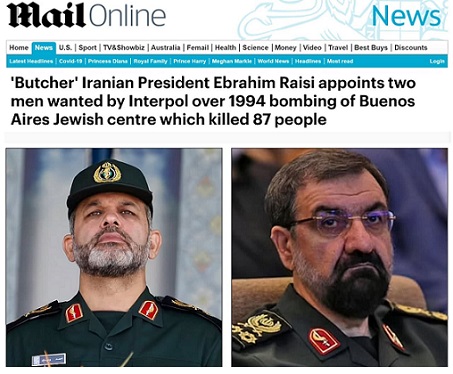 میل آنلاین انگلستان روز ۷شهریور درباره کابینه رئیسی جلاد نوشت: رئیسجمهور «جلاد» رژیم ایران دو نفری را که به اتهام دست داشتن در بمبگذاری آمیا در سال۱۹۹۴ در بوئنوسآیرس باعث کشته شدن ۸۷نفر شدند و تحت تعقیب انترپل هستند، بهعنوان دو عضو کابینه خود برگزیده است.