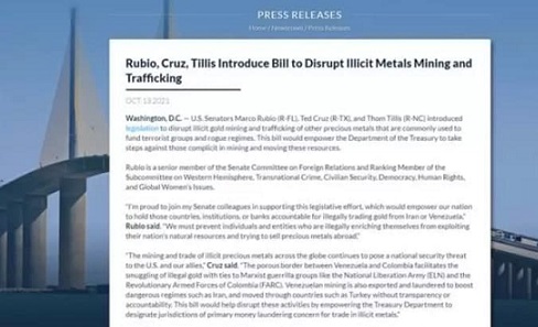 سه تن از اعضای ارشد سنای آمریکا، مارکو روبیو، تد کروز و تام تیلیس لایحهیی را برای متوقف ساختن استخراج غیرقانونی طلا و قاچاق سایر فلزات گرانبها که معمولاً برای تأمین تروریستها و رژیمهای یاغی هزینه میشود، ارائه دادند.