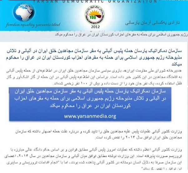 حمله پلیس آلبانی به مقر سازمان مجاهدین خلق در تیرانا که هزاران کیلومتر از مرزهای ایران دور است در حالی صورت میگیرد که این سازمان تحت حفاظت سازمان ملل و آمریکا به آلبانی منتقل شدهاند، از طرفی دیگر تلاش مذبوحانه رژیم برای حمله به احزاب کوردستان ایران و مقرات آنها در کردستان عراق نشان از درماندگی رژیم ملایان در تهران و چراغ سبز حکومتهای غرب و منطقه دارد. ناگفته نماند که سازمان دموکراتیک یارسان مخالف هر گونه ماجراجویی نظامی از طرف گروههای مخالف رژیم است، اما از حق دفاع مشروع حمایت میکند. سازمان دموکراتیک یارسان ضمن محکوم کردن حمله پلیس آلبانی به مقر سازمان مجاهدین و مقرات احزاب کوردستان ایران، از سازمان ملل میخواهد که جلو شانتاژهای رژیم را گرفته، عکسالعمل در خور نشان داده و اجازه ندهد مخالفان رژیم توتالیتر ایران مورد حمله وحشیانه قرار گیرند.