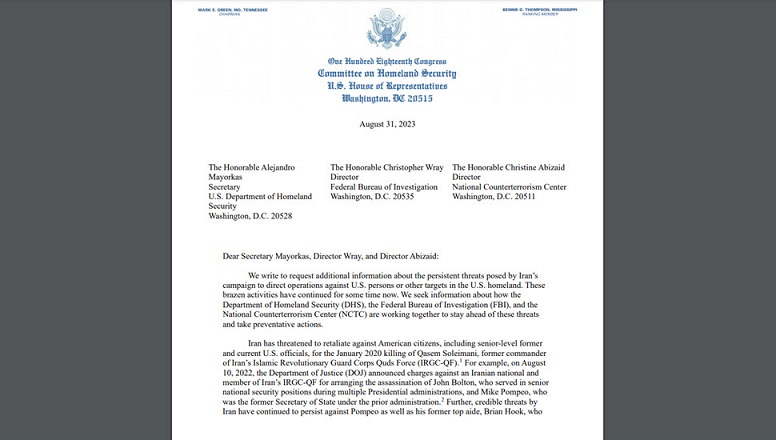 «وزیر محترم مایورکاس، مدیر Wray، و مدیر Abizaid: ما نامه مینویسیم تا اطلاعات بیشتری درباره تهدیدات دائمی ناشی از ایران درخواست کنیم. کمپین برای هدایت عملیات علیه افراد آمریکایی یا سایر اهداف در سرزمین ایالات متحده. این فعالیتهای گستاخانه مدتی است که ادامه یافته است. ما بهدنبال اطلاعات در مورد چگونگی