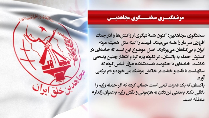 سخنگوی مجاهدین: اکنون شمهٔ دیگری از واکنشها و آثار جنگافروزی سر مار را همه میبینند. قیمت را البته مثل همیشه مردم ایران و بیگناهان میپردازند. اصل موضوع این است که خامنهای در گسترش حمله به پاکستان، گز نکرده پاره کرد و انتظار چنین پاسخی نداشت. خامنهای با حکومت دستنشانده عراق قیاس کرده که سالهاست با ذلت و خفت در خاکش موشک میخورد و دم برنمیآورد.
