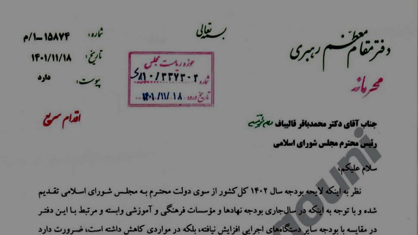 – دستورات خامنهای به قالیباف در مورد افزایش بودجهٔ ۱۸ نهاد و مؤسسهٔ «وابسته و تابعهٔ به دفتر مقام معظم» در بودجه ۱۴۰۲