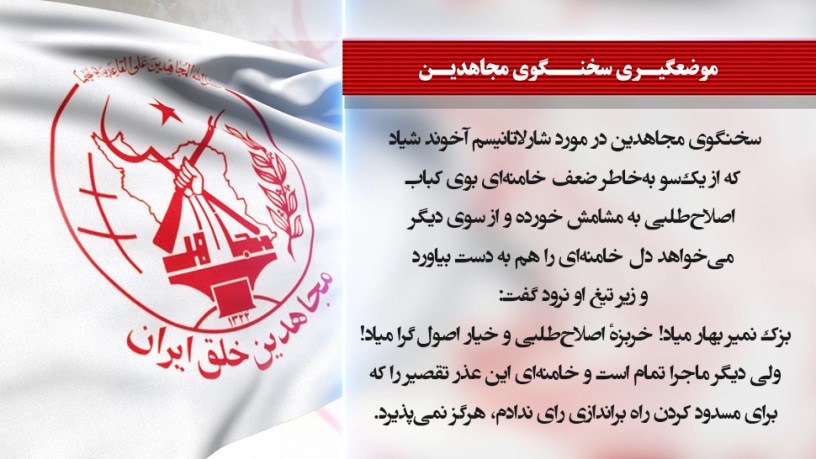 سخنگوی مجاهدین در مورد شارلاتانیسم آخوند شیاد که از یکسو بهخاطر ضعف خامنهای بوی کباب اصلاحطلبی به مشامش خورده و از سوی دیگر میخواهد دل خامنهای را هم به دست بیاورد و زیر تیغ او نرود گفت: