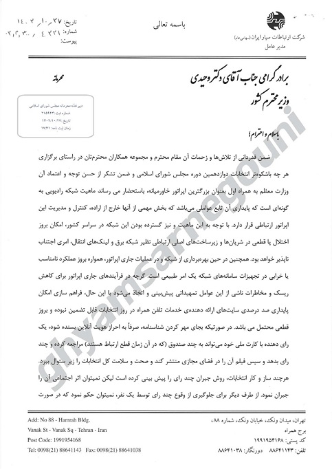 ضمن قدردانی از تلاشها و زحمات آن مقام محترم و مجموعه همکاران محترمتان در راستای برگزاری هر چه باشکوهتر انتخابات دوازدهمین دوره مجلس شورای اسلامی و ضمن تشکر از حسن توجه و اعتماد آن وزارت معظم به همراه اول بهعنوان بزرگترین اپراتور خاور میانه، به استحضار میرساند ماهیت شبکه رادیویی به گونهای است که پایداری آن تابع عواملی میباشد که بخش مهمی از آنها خارج از اراده، کنترل و مدیریت این اپراتور ارتباطی قرار دارد.
