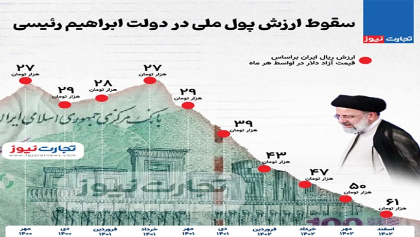 این امری کمسابقه است که در عرض دو سال شاهد سقوط وحشتناک پول ملی هستیم. «قیمت دلار از ابتدای دولت رئیسی بیش از ۲.۵ برابر شده است. زمانی که دولت سیزدهم آغاز به کار کرد، قیمت دلار حدود ۲۷ هزار تومان بود اما حالا و در روزهای آخر اسفند ۱۴۰۲، دلار به ۶۱ هزار تومان رسیده است» (تجارت۱۷اسفند۱۴۰۲).