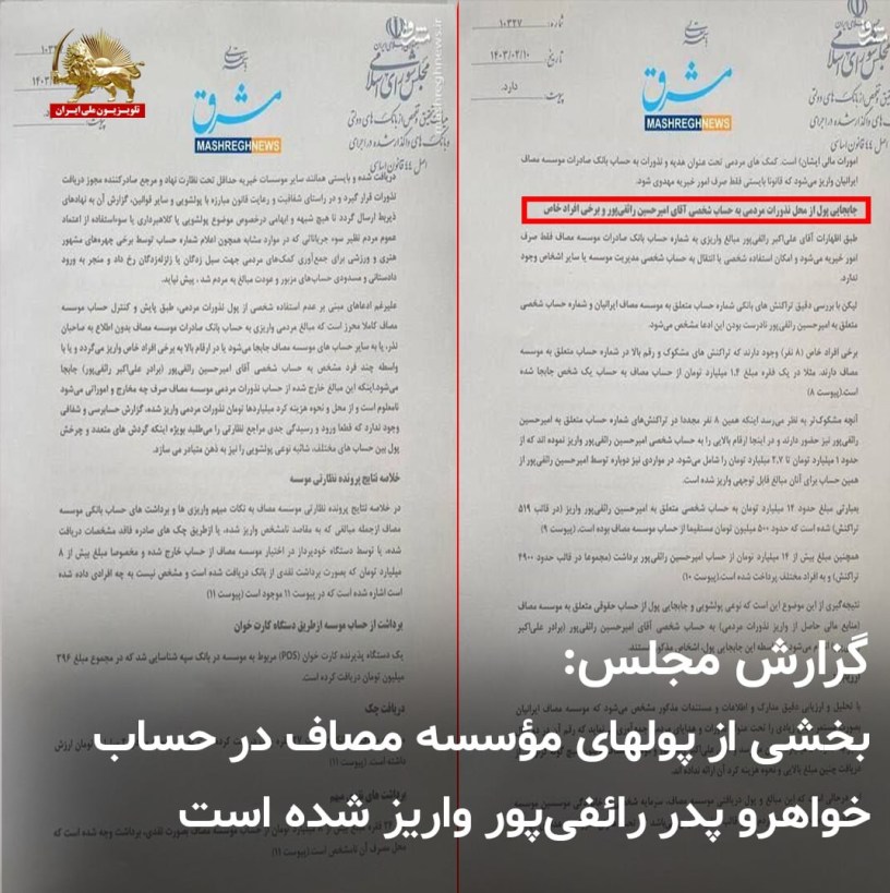 در ادامه درگیری بین دستجات باند اصولگراها بر سر ریاست مجلس، مجلس رژیم یک از مؤسسه مصاف وابسته به استاد خودخوانده بسیجی رائفیپور منتشر کرد که در آن بخش دیگری از غارت و چپاول ثروت و داراییهای مردم ایران توسط کارگزاران رژیم افشا میشود، در گزارش مجلس رژیم آمده است: