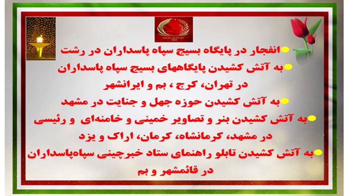 - به آتش كشيدن پايگاههاي بسيج سپاه پاسداران در تهران، كرج ، بم و ايرانشهر