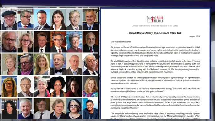 ما، کارشناسان، سازمانهای حقوقبشری و حقوقدانان بینالمللی، برندگان جایزه نوبل و سیاستمدارانی که در خدمت دموکراسی و حقوقبشر هستند، در پی انتشار گزارش سرفصلی گزارشگر ویژه سازمان ملل در مورد وضعیت حقوقبشر در ایران در خصوص جنایات سبعانه ایران در ۴۵سال گذشته، این نامه را مینویسیم.