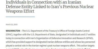 وزارت خزانه داری آمریکا ۱۴فرد و ۱۷ نهاد مرتبط با برنامه هستهای و موشکی رژیم ایران را به فهرست تحریمها افزود