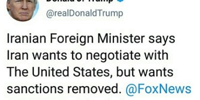 ترامپ: وزیر خارجه ایران گفته میخواد با آمریکا مذاکره کنه اما تحریمها باید برداشته بشه. جواب ما اینه: نه ممنون!