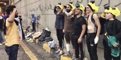 گروهی از جوانان عراقی که گازهای اشک آور را خاموش میکنند