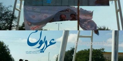 فیلم لحظه سرنگون کردن تابلوی تروریستهای مدافع اسد در دزفول و تکه تکه کردن آن توسط مردم دلیر دزفول