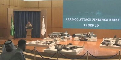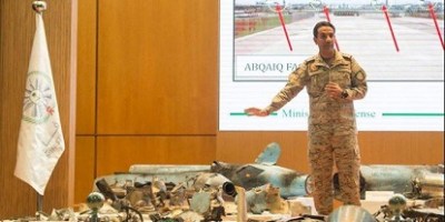 کنفرانس مطبوعاتی سرهنگ ترکی المالکی با نشان دادن موشکهای رژیم ایران که تاسیسات نفتی آرامکو را هدف قرار دادند