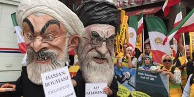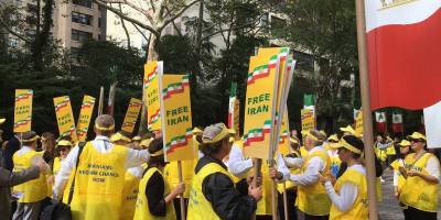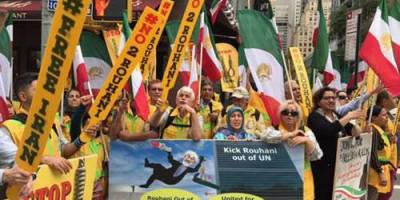 تجمع ایرانیان آزاده علیه حضور آخوند روحانی در مجمع عمومی ملل متحد، در مقابل سازمان ملل