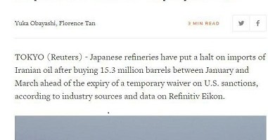 توقف واردات نفت ازایران توسط پالایشگاههای ژاپن